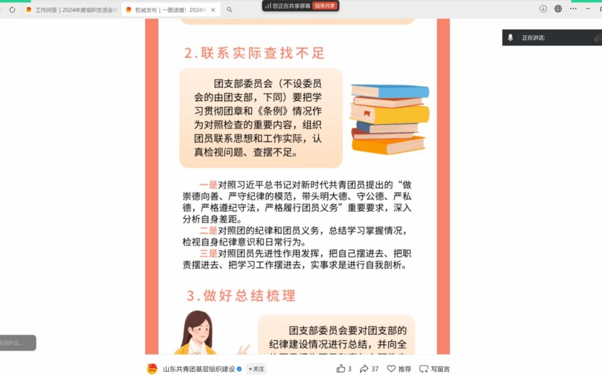 为深入贯彻落实共青团中央关于基层组织建设的相关要求,规范基层团组织生活,提升团员教育管理质量,bat365正版唯一官网根据《bat365正版唯一官网关于指导基层团支部召开2024年度组织生活会和开展团员教育评议的工作提示》(以下简称《工作提示》),结合示范性组织生活会,于2025年3月3日组织全体团支部书记开展线上组织生活会工作培训,明确组织生活会基本要求和注意事项。会议由聂安琪同学主持,学院全体团支书参加会议。