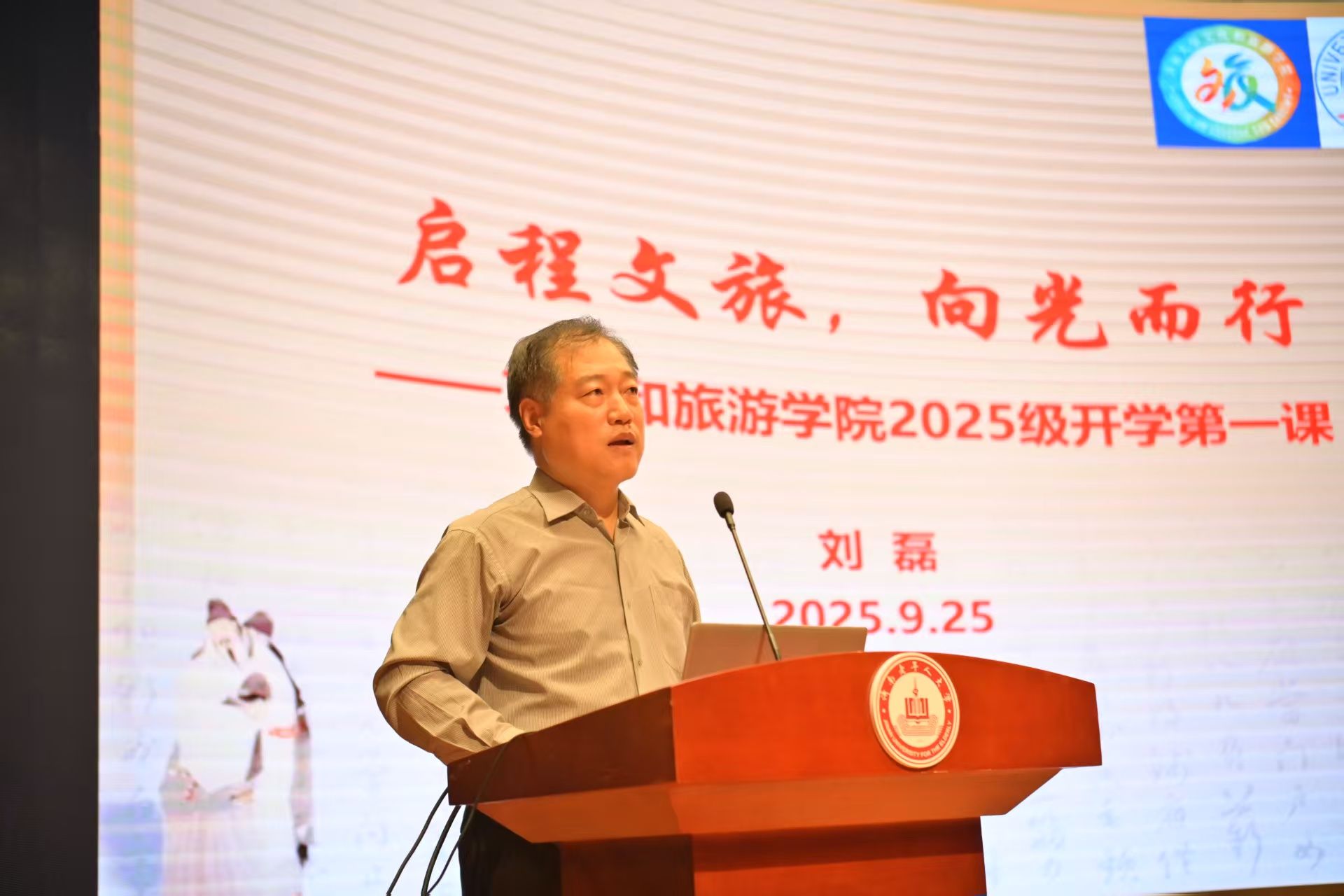 活动伊始,学院院长刘磊代表学院致辞,他首先向全体2025级新生表示最热烈的欢迎和最诚挚的祝贺。介绍了学院在人才培养、科学研究、社会服务等方面取得的丰硕成果。他指出,当今时代,文化和旅游深度融合已成为推动经济社会发展的重要引擎,作为未来的文旅英才,同学们生逢其时,重任在肩。他勉励新生要尽快完成角色转变,树立远大理想,既要博览群书、夯实专业基础,也要勇于实践、拓展国际视野,努力成长为有家国情怀、有专业本领、有创新精神、有责任担当的高素质复合型文旅人才。