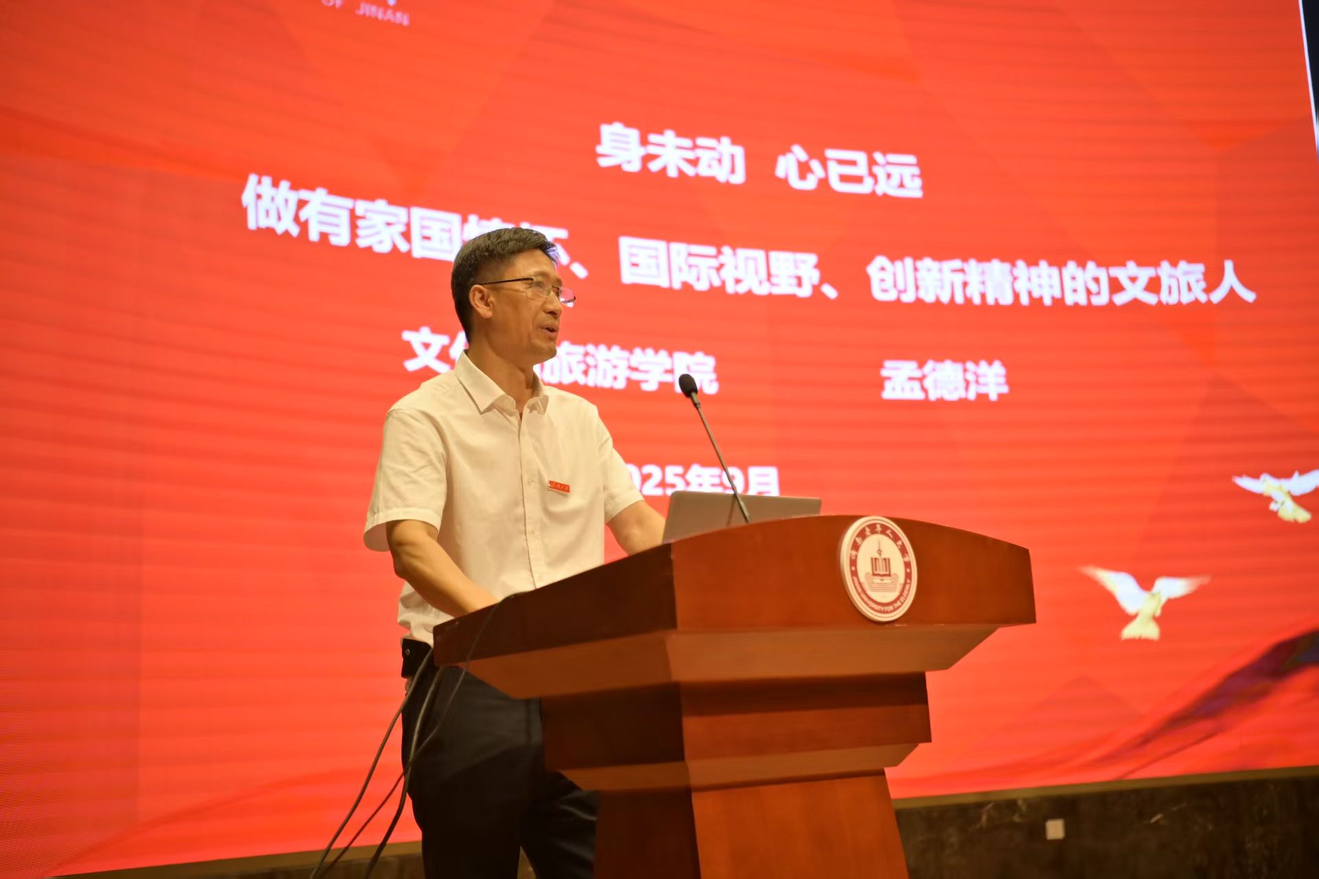 本科生新生代表刘森洋和研究生新生代表李白雪分别发言,在发言中他们表达了将倍加珍惜宝贵的学习机会,以主动探索的精神、踏实严谨的学风和敢于突破的勇气,潜心治学,砥砺前行。不负时代韶华,不负师长期待,在未来的学习生涯中展现新一代青年的风采,努力成长为有理想、有担当的“文旅人”。在校生代表、国家奖学金获得者孙梦彤,向学弟学妹们分享了在校学习生活的经验与体会。她以“拥抱变化,收获成长”为主题,结合自身经历,从课程学习、社团活动、社会实践、时间管理等方面给出了实用建议。她鼓励新生们勇敢尝试,不怕失败,在探索中找到自己的热爱;学会平衡,张弛有度,在忙碌中保持身心健康;珍惜同窗情谊,互帮互助,共同进步。
