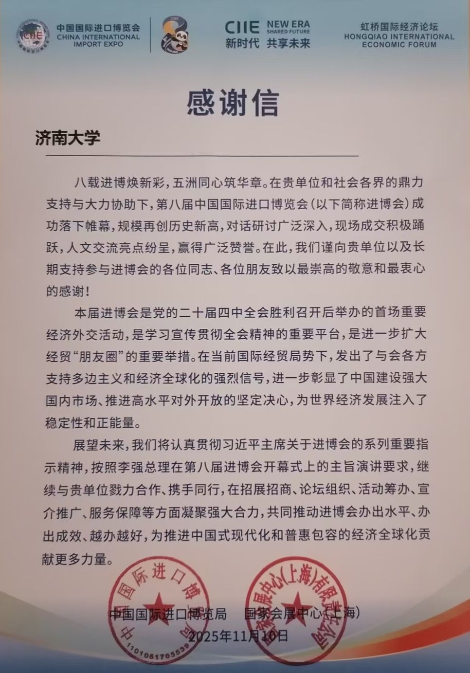 近日,鉴于bat365官网旅游管理专业2023级实习生在第八届中国国际进口博览会(以下简称“进博会”)活动筹办与服务保障工作中的优异表现,学校收到了来自中国国际进口博览局、国家会展中心(上海)有限责任公司的感谢信。
