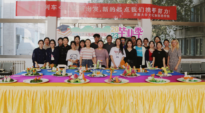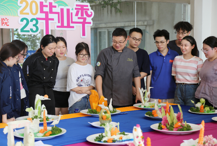 6月20日上午,bat365正版唯一官网烹饪与营养教育专业大二学生于文旅楼大厅摆设食品雕刻展台,为2023届毕业生们送上最诚挚的祝福。各种寓有美意的食品展台齐聚一堂,供大家观赏。