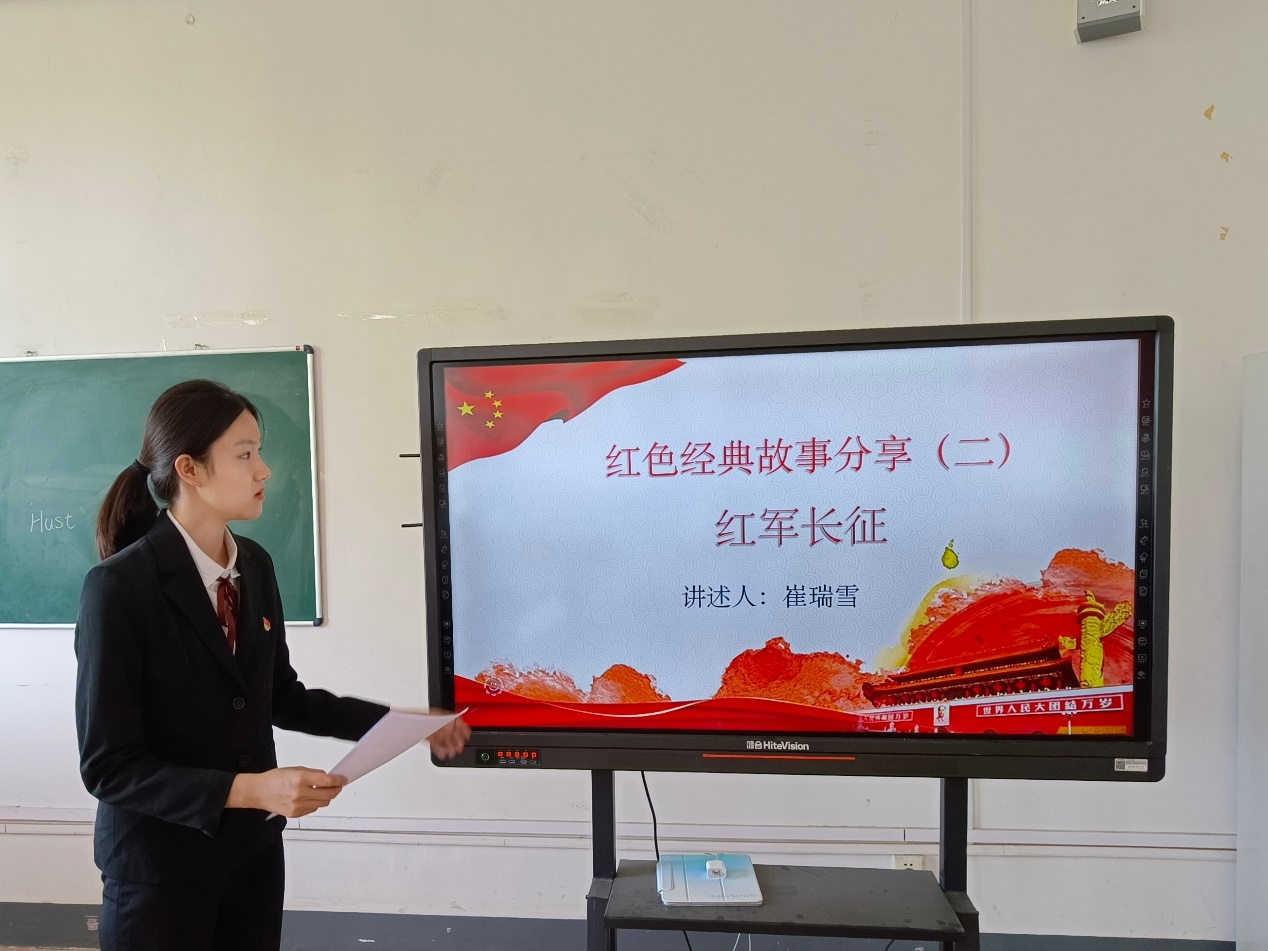 本次分享会由张莉老师进行主持,崔瑞雪同学进行分享和讲解。首先,崔瑞雪同学主要从历史背景、基本路线、长征阶段、历史意义等方面带领同学们重温红军长征。在帮助大家了解史实的同时,她通过讲述诸多红军战士、将领在长征中的典型事例,引导同学们对红军精神进行思考与体会。最后,她呼吁大家作为预备党员,需要从长征故事中汲取精神力量,学习不畏艰险、冲锋在前、担当在前、奉献在前的精神,用担当和责任彰显新时代新青年的新气象、新风采!