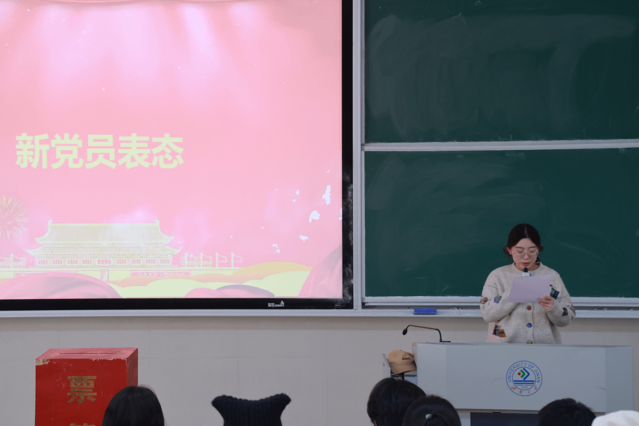 随后,吕龙飞同志代表党支部书记商智慧同志报告了对尹文琪同志的审查情况,表示在接收尹文琪同志为预备党员的期间未收到党员和群众的异议,明确指出尹文琪同志的入党申请已经经过充分讨论和评议,符合党员标准,建议大会予以接收为中共预备党员。