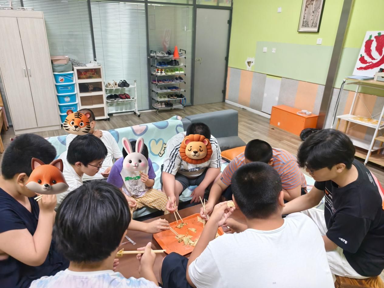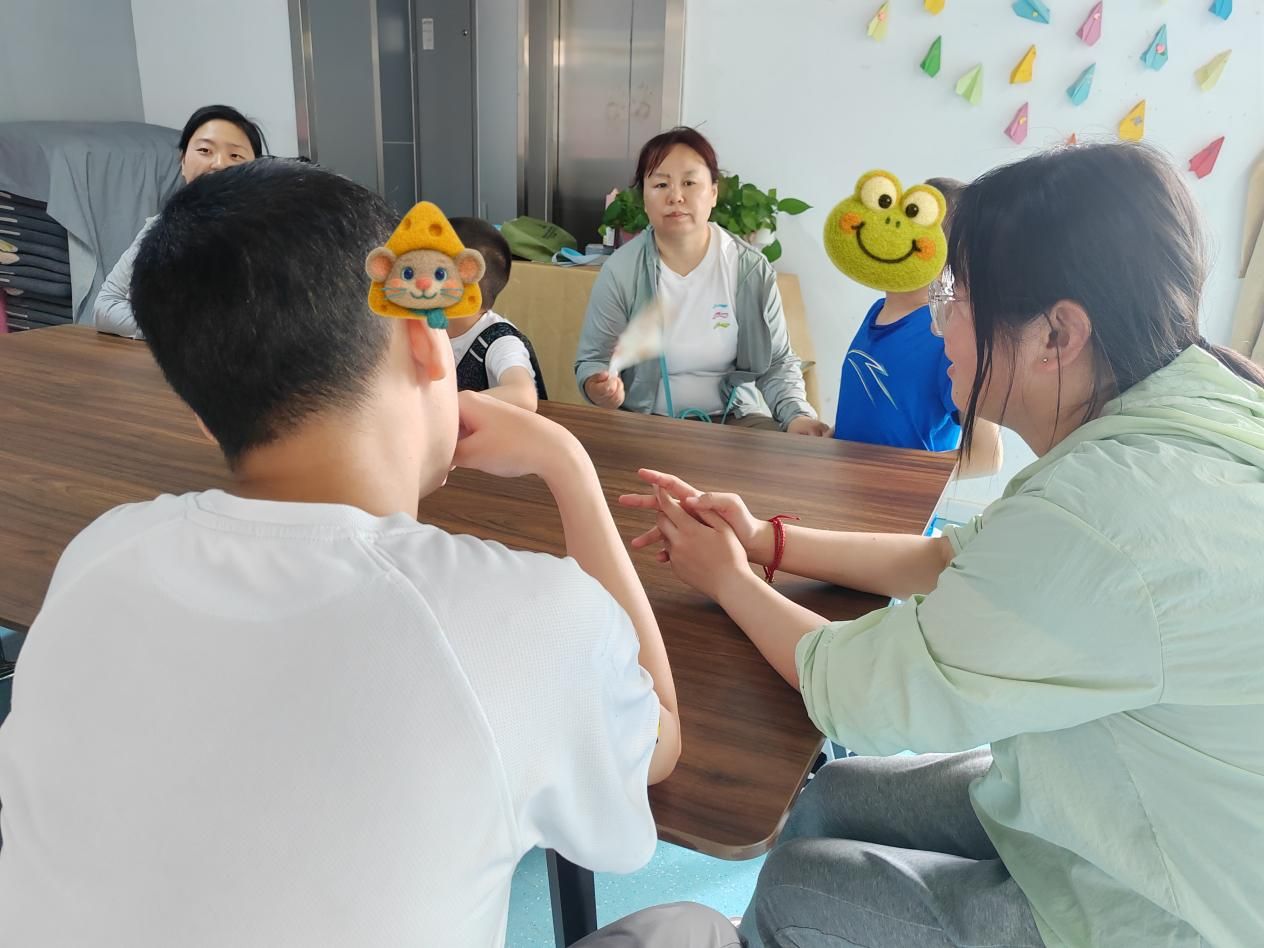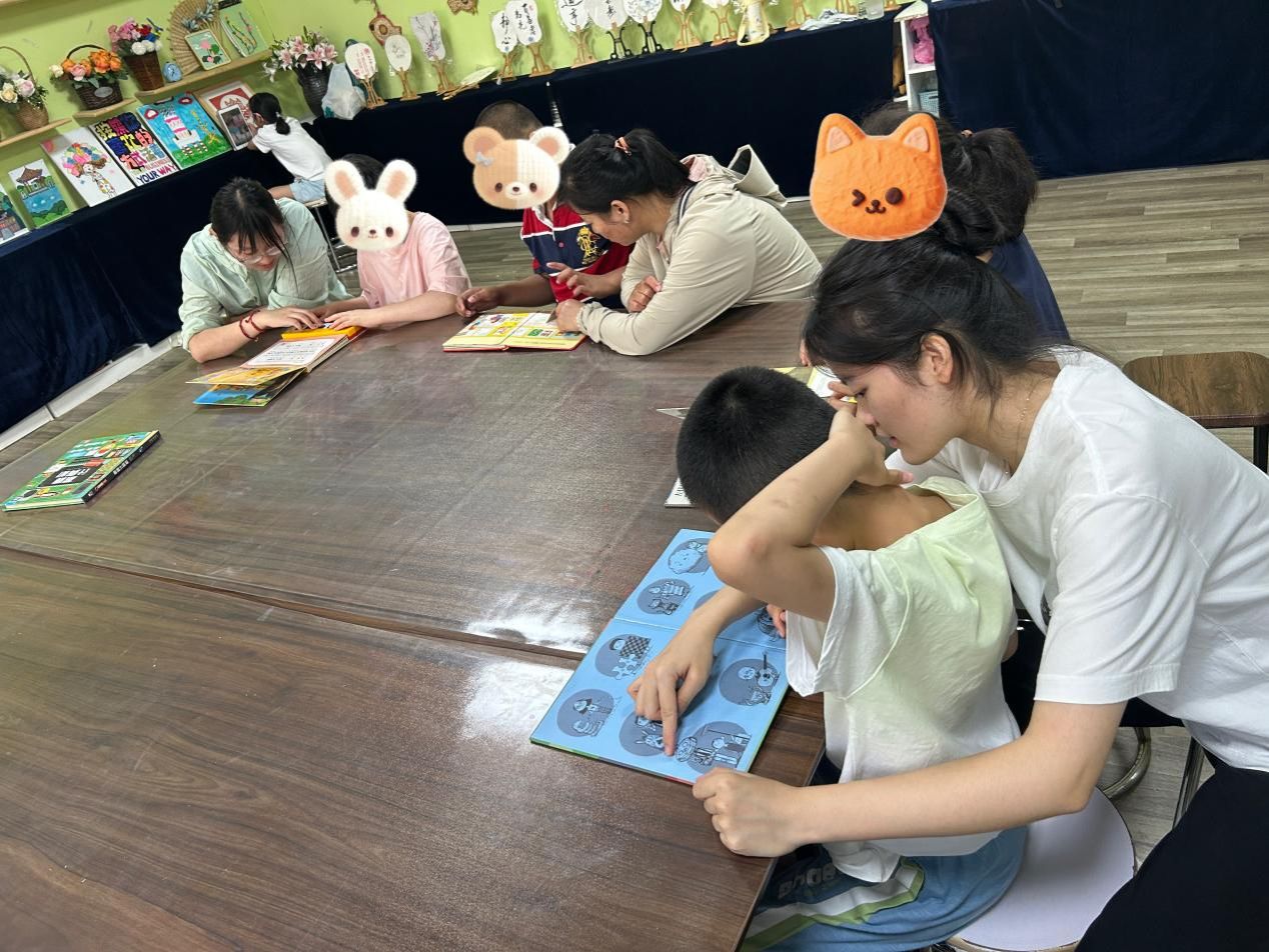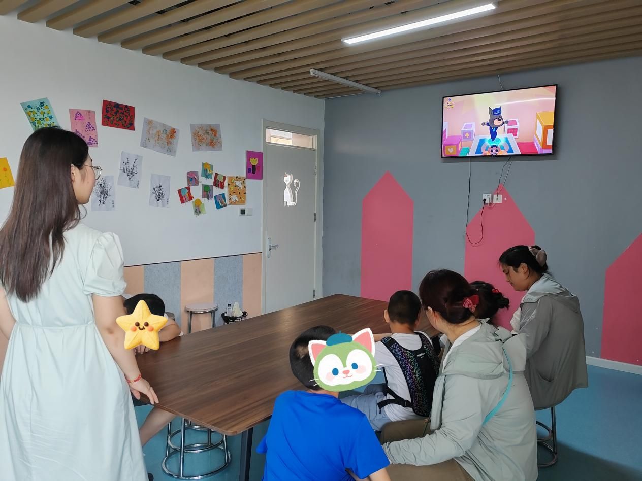 康复中心的课堂上,团队成员化身为“同行者”,全程参与孩子们的学习时光。认知课上,队员程明菲与孩子并排而坐,跟随老师的引导共同感知身体的存在;讨论环节,队员李雨薇耐心倾听孩子的想法,用鼓励的话语引导思考;观看动画片时,队员黄艺琛和孩子一起欢笑,适时讲解画面里的故事。当孩子因为难题皱眉时,队员轻轻点拨思路;当孩子主动分享见解时,队员及时送上肯定的掌声。课堂上的并肩同行,不仅为孩子们的学习增添了助力,更让他们在互动中感受到平等与尊重,让成长的每一刻都充满温暖的陪伴。