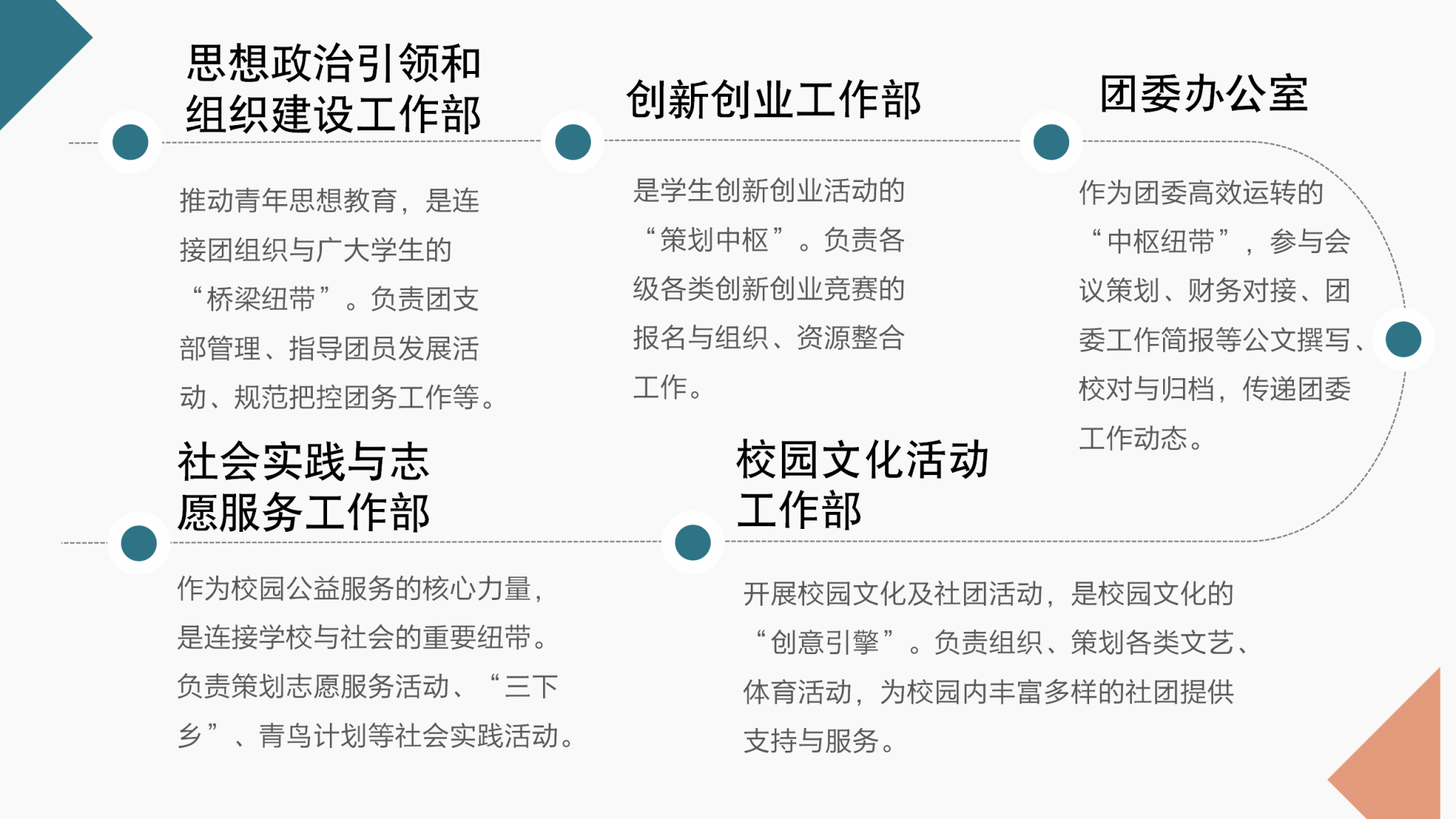 学生会组织架构为“主席团+工作部门”,下设五大部门。