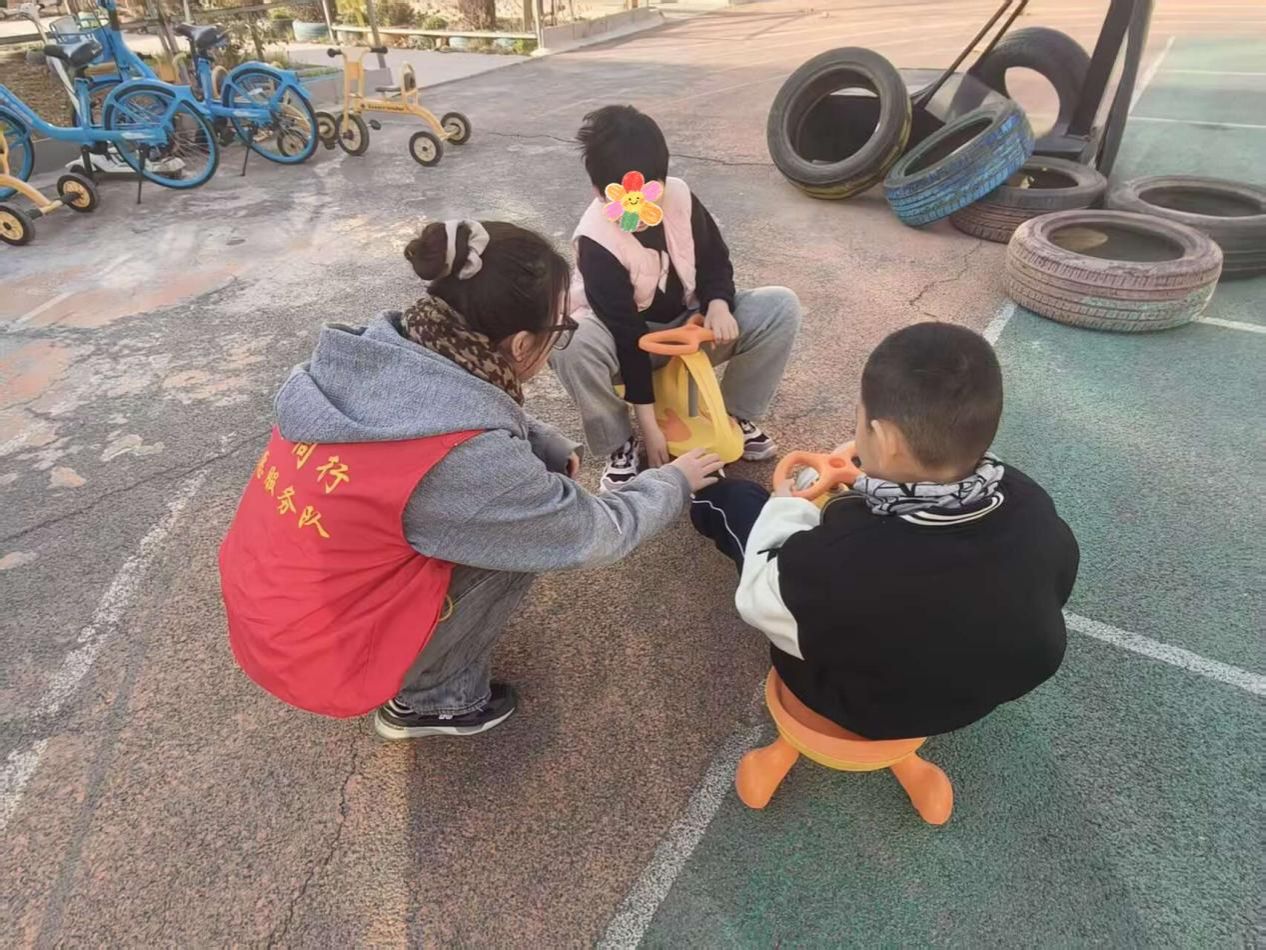 儿童小车静静伫立,成了拉近心距的纽带。志愿者悄然蹲身,居于两个孩子之间,指尖轻引,耐心指引他们探寻游戏的乐趣。原本疏离的身影,在并肩互动中渐渐靠近;原本拘谨的眉眼,在欢声笑语中慢慢舒展。当一个孩子独自乘上小车,志愿者便静静守在身旁,目光温柔,始终追随着他的身影,不言不语,却将守护与关怀藏进每一个细微的瞬间。游戏有声,陪伴无言,这份悄然滋生的默契,让“星星的孩子”在被关注中,寻得一份安稳与自在。