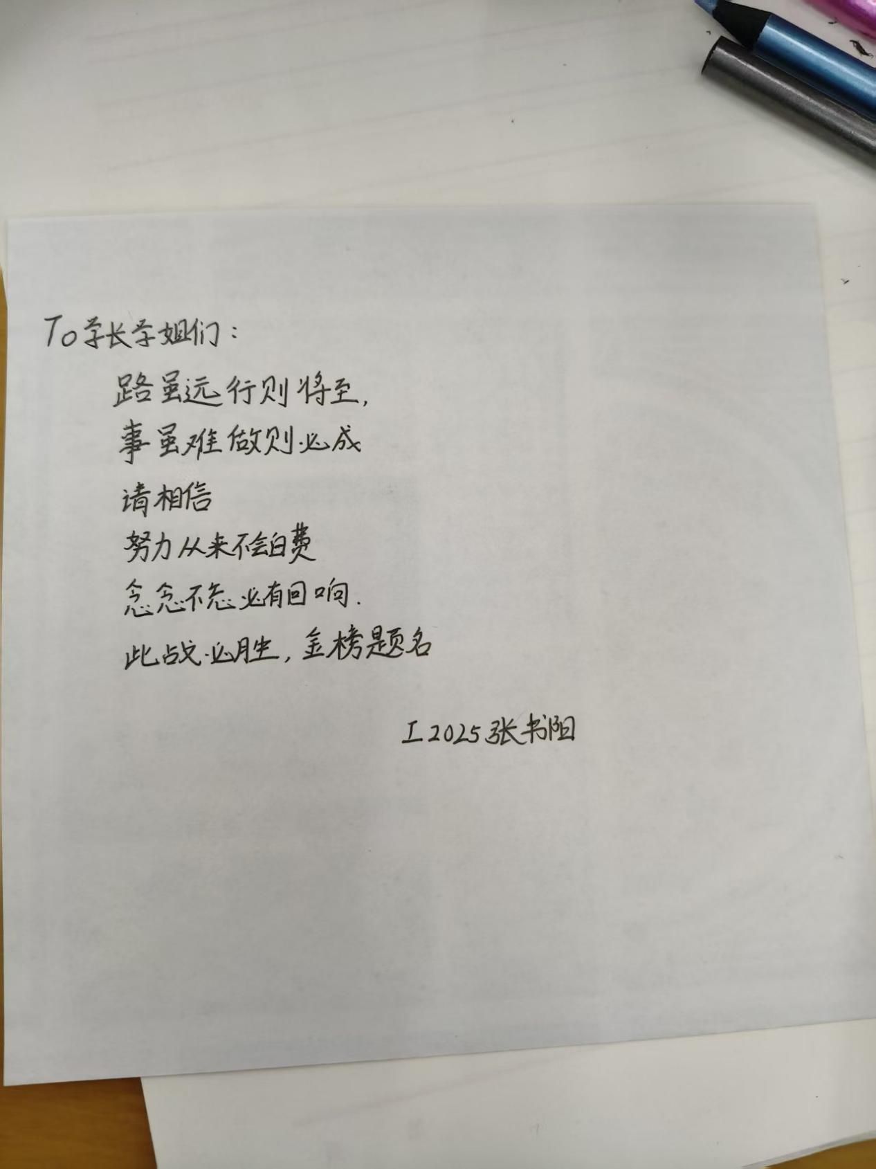 我们都知道,这一路并不轻松。书本堆成山,时间总不够用,焦虑像潮水一样时不时涌上心头。有时候,你们也会在某个深夜突然怀疑:我能不能行?这样的付出,真的会有回报吗?可我们想说这些情绪并不可怕,说明你们在乎自己的梦想。请你们相信,现在的每一步,就像一棵树,在地下默默扎根的时光,没人看见,却在为破土后的挺拔积蓄力量。