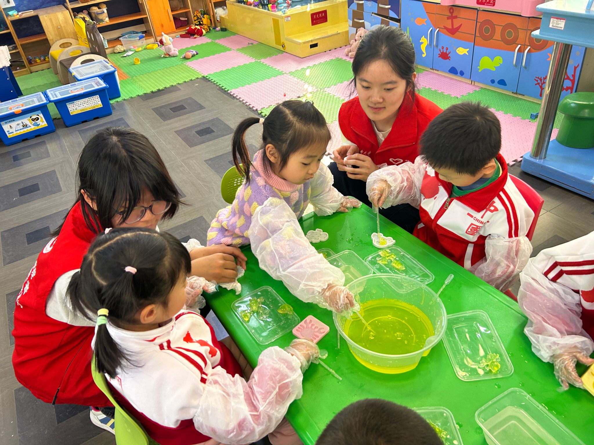 活动全程,志愿者们始终将安全置于首位。所有实验材料均选用食品级原料,且反复强调“不可食用”的原则,师生配比也严格遵循安全标准,确保孩子们能安心探索。烹饪与营养教育专业的志愿者们,将专业课堂中的分子料理知识拆解为幼儿可感知、可操作的实验步骤,让原本抽象的化学反应,变成了看得见、摸得着的趣味体验。