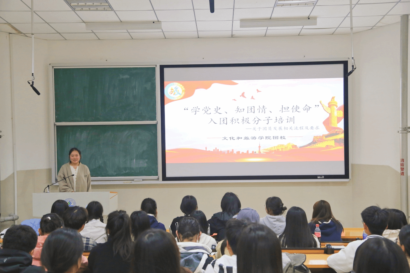 开班仪式由学生会组织团学部陈昕冉同学主持,学院团委书记吕龙飞老师以“坚定理想信念,勇担时代使命”为主题,向入团积极分子讲述为什么要入团、什么是共青团、以及如何坚定理想信念。他带领入团积极分子回顾中国共产主义青年团的发展历程,感悟共青团组织成立时的初心和使命,向入团积极分子介绍“有理想、敢担当、能吃苦、肯奋斗”的文旅优秀团员们的动人事迹,鼓励他们学习榜样精神,汲取奋进力量,以坚定的理想信念和不懈的奋斗精神脚踏实地把每件平凡的事做好,时刻以一名共青团员的标准要求自己,勤奋学习,努力工作,戒骄戒躁,砥砺前行。入团积极分子们纷纷表示要时刻以团章为准则,铭记团员标准,严格要求自己,在学习和生活中处处争先,逢旗必夺,做遵守团章的模范。