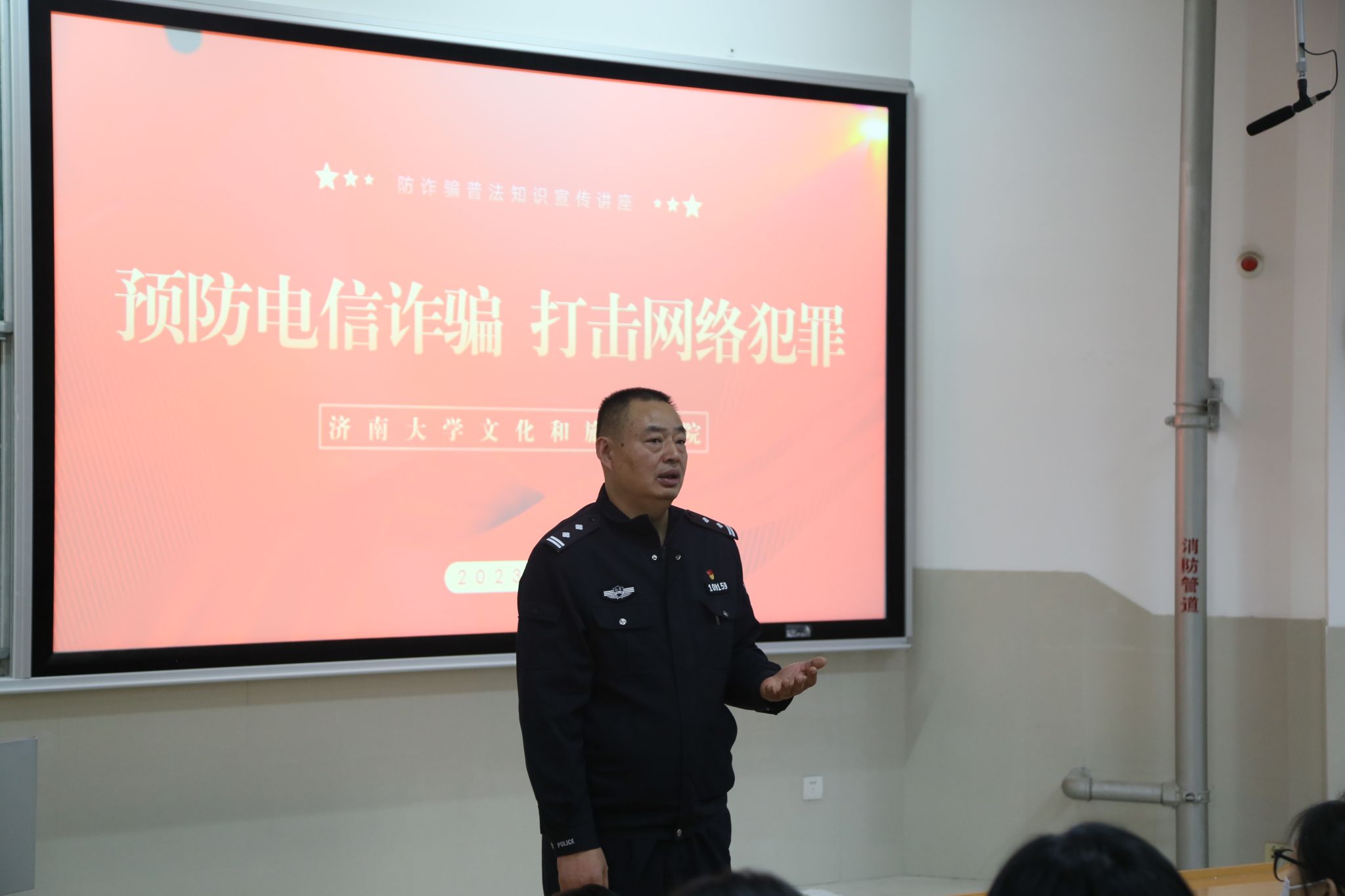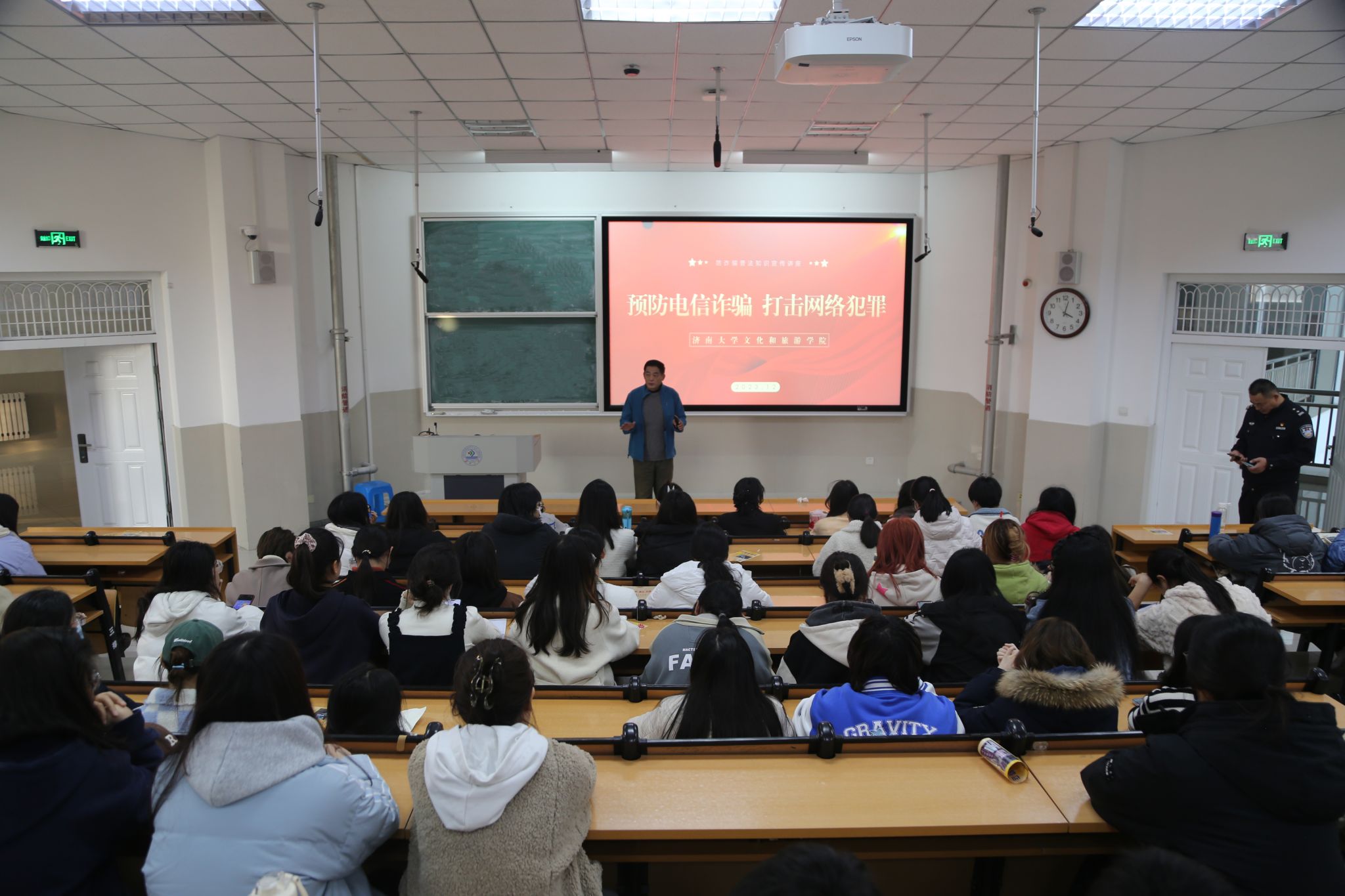 为提升学生反诈意识、增强反诈能力,切实做好安全教育,进一步筑牢学院安全屏障。12月5日下午,学院联合bat365官网保卫处,邀请济南市公安局舜玉路派出所在舜耕校区三教201教室开展了防范电信诈骗宣传讲座。济南市公安局舜玉路派出所副所长孙全修警官、学校保卫处舜耕校区保卫科科长张韶春、学办部分老师及200余学生参加此次活动。讲座由学办老师王明扬主持。