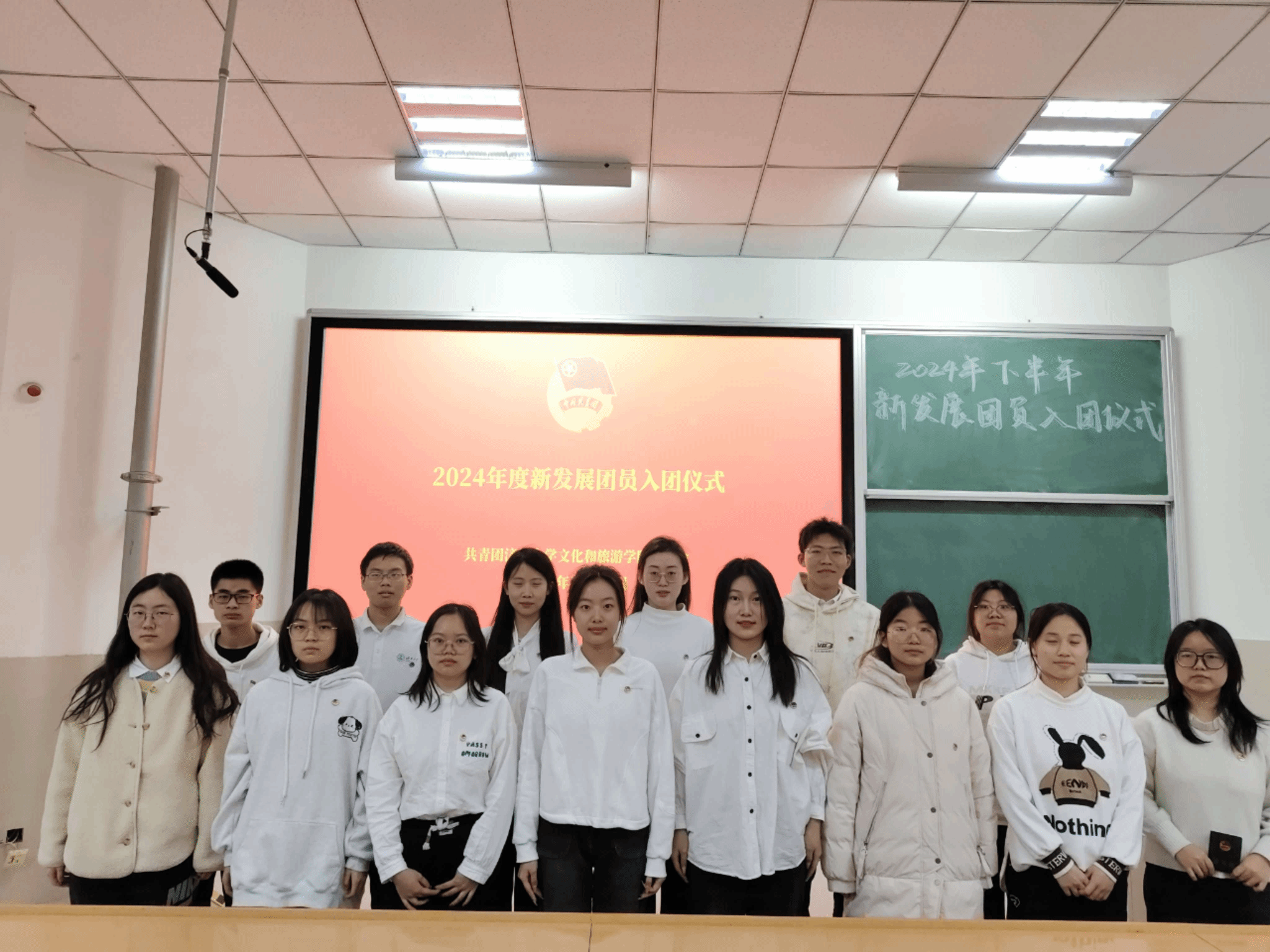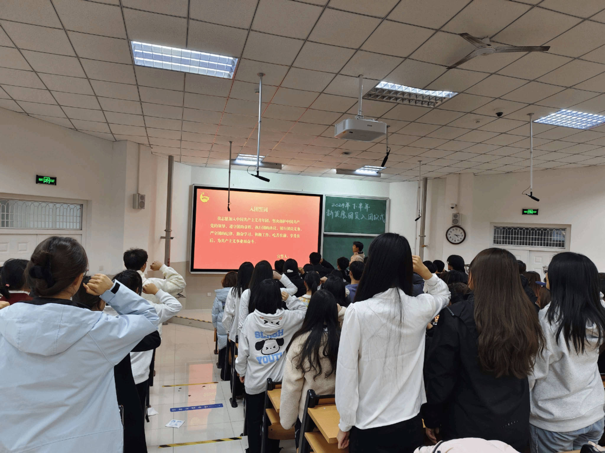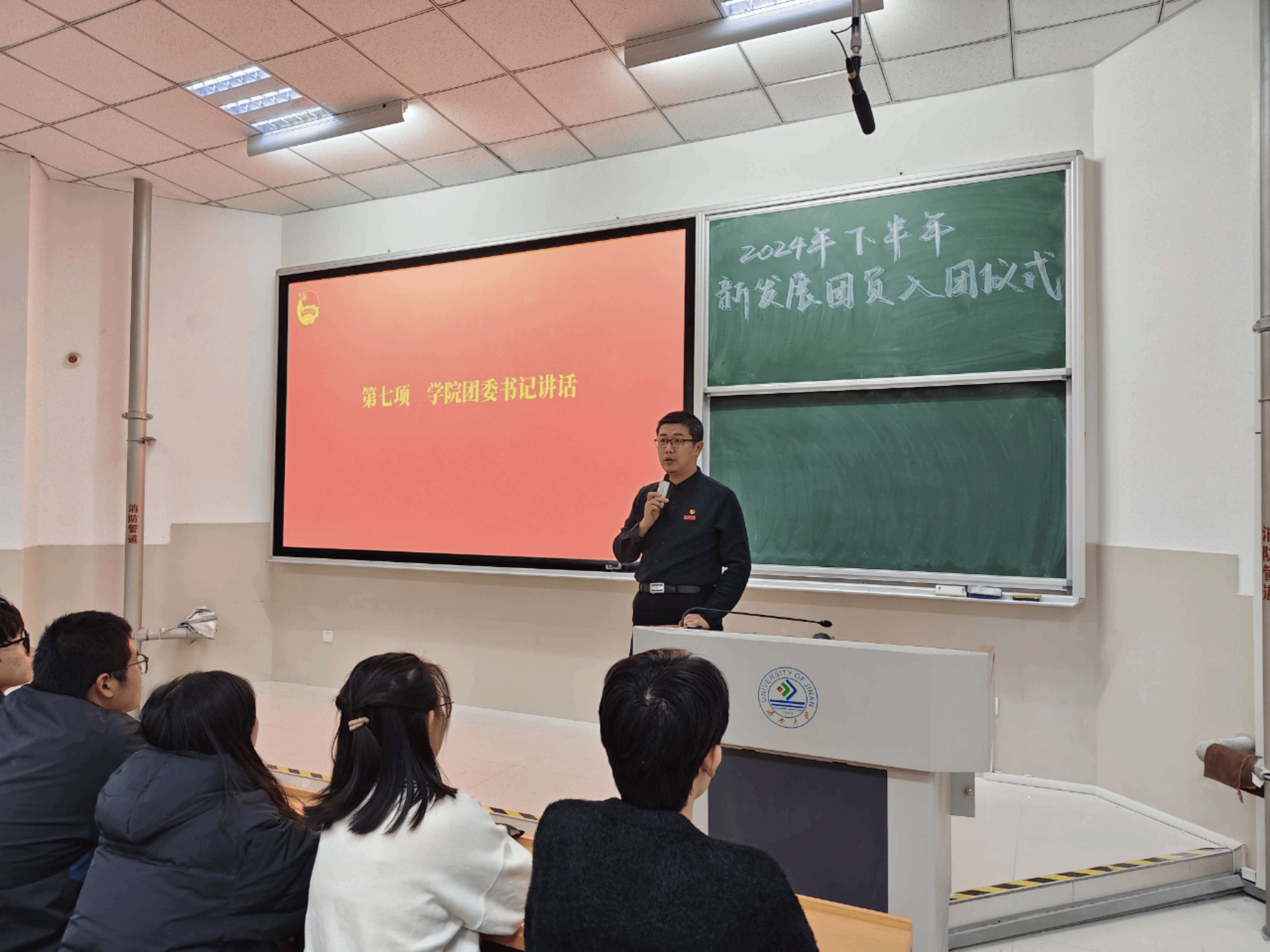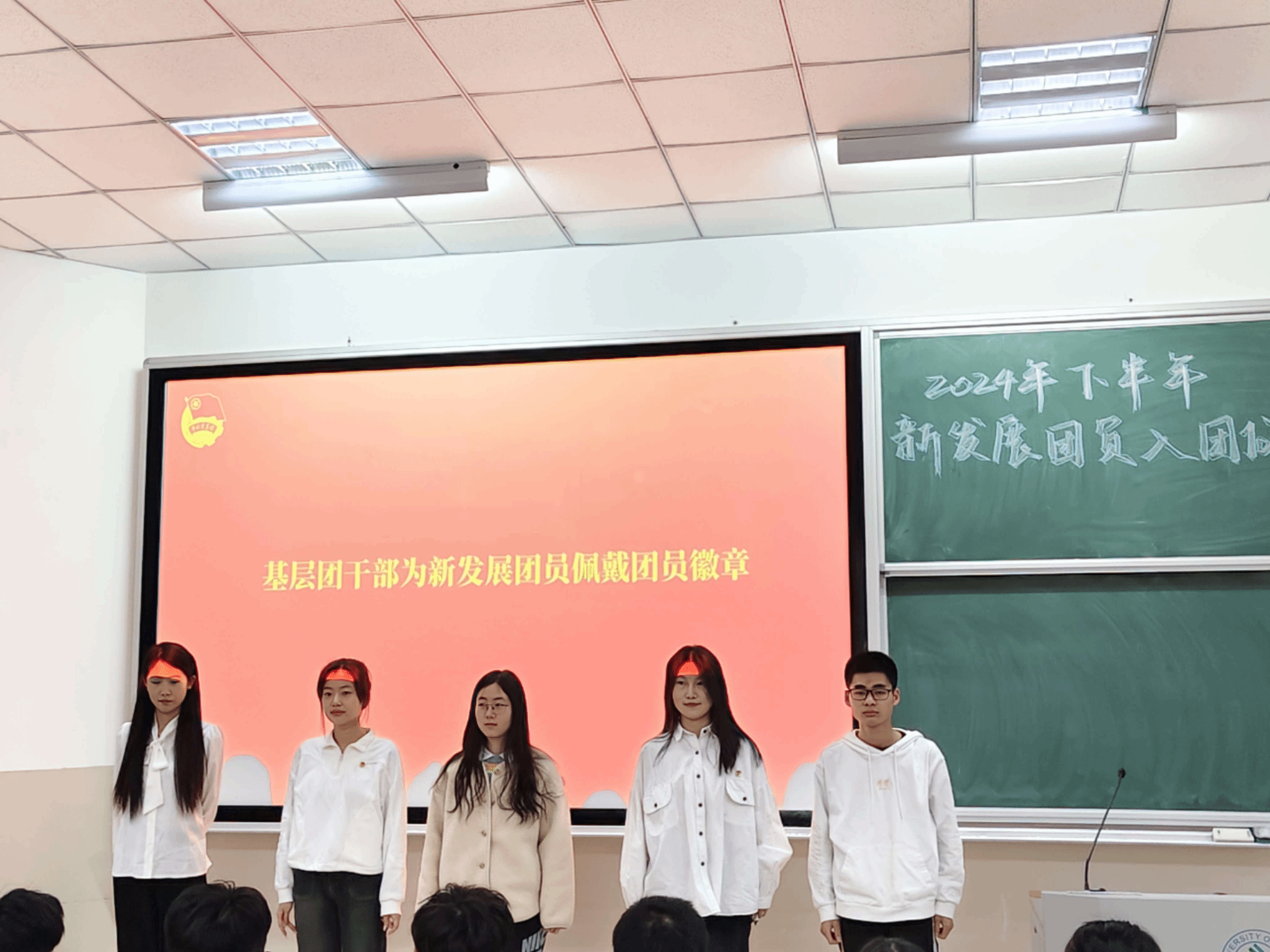 仪式在庄严的国歌中拉开序幕,主持人首先宣读了学院2024年度新发展团员入团名单,并由基层团干部为新团员佩戴上了团徽。刘炳玺同学带领全体团员面向团旗庄严宣誓,表达出对共青团组织的无限忠诚和对共产主义事业的坚定信念。
