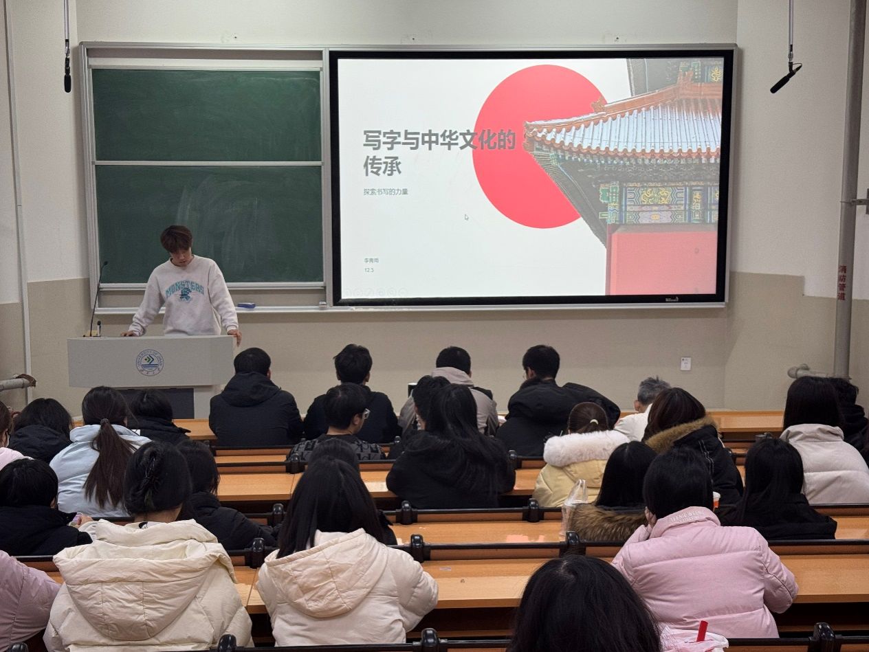 为丰富同学们的校园生活,充分发挥同学们的特长与技能,2024年12月3日,bat365正版唯一官网bat365正版唯一官网于舜耕校区D3J101教室开展朋辈技能特长大会。李青雨同学作为主讲人向同学们讲解汉字的书写与中华优秀传统文化之间的关系,同学们踊跃参加,学习有关书写的相关知识。